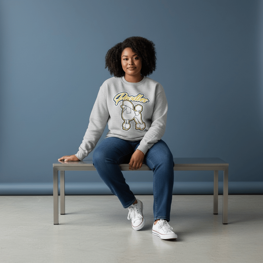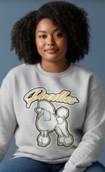 This cozy gray crewneck sweatshirt features a bold poodle graphic paired with playful lettering for a fun, standout look. Made with soft, durable fabric, it offers a comfortable fit perfect for everyday wear. The classic crew neckline and relaxed silhouette make it easy to style with jeans, leggings, or joggers. Designed for both comfort and personality, this sweatshirt adds a touch of charm to any casual outfit.