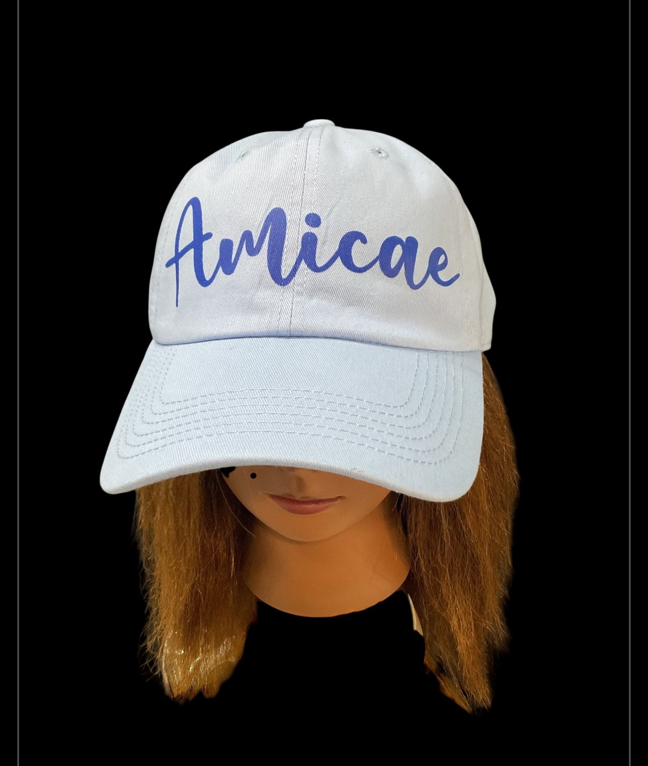 This is a light blue baseball cap featuring the word “Amicae” in a bold, script-style royal blue font printed across the front.