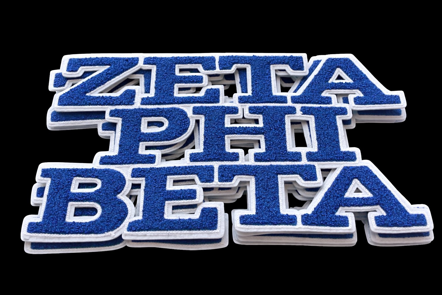 Bold and eye-catching chenille patch featuring Zeta Phi Beta lettering in royal blue with crisp white trim. Perfect for jackets, sweaters, bags, and custom apparel. Soft textured finish with standout detail made to represent sisterhood in style.